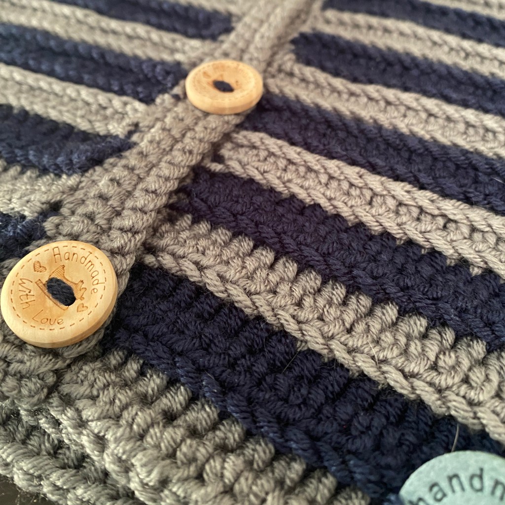 This is a soft jacket, warm and cozy. It is made with acrylic-bamboo mix yarn, very soft to the touch, and wooden buttons.