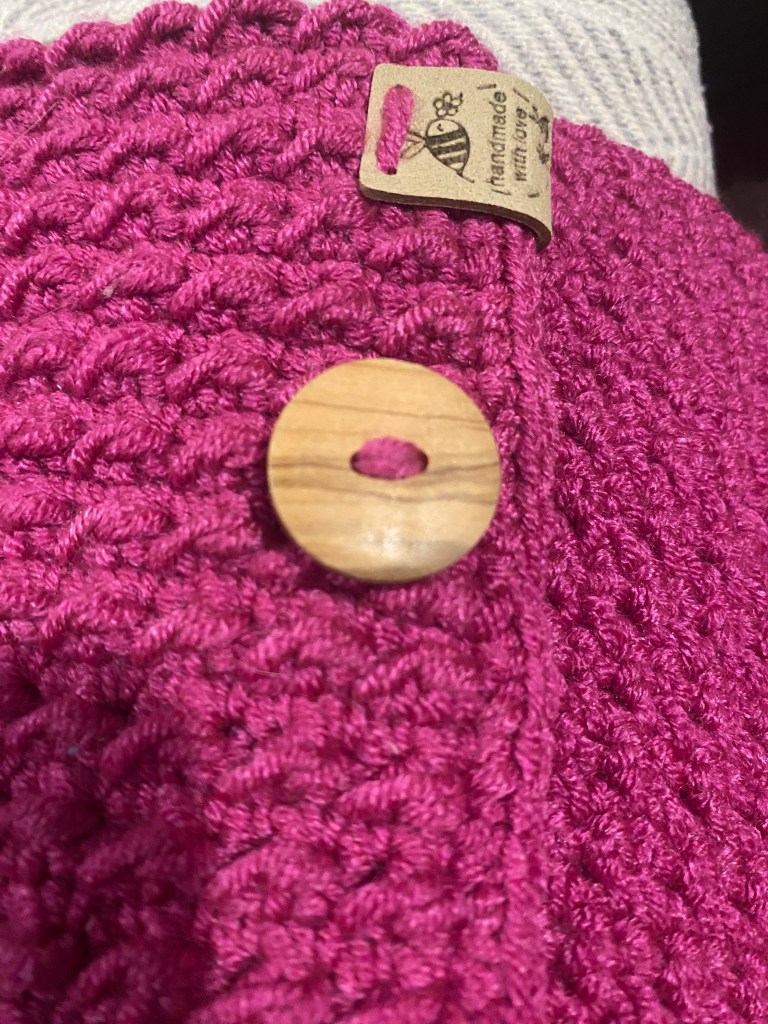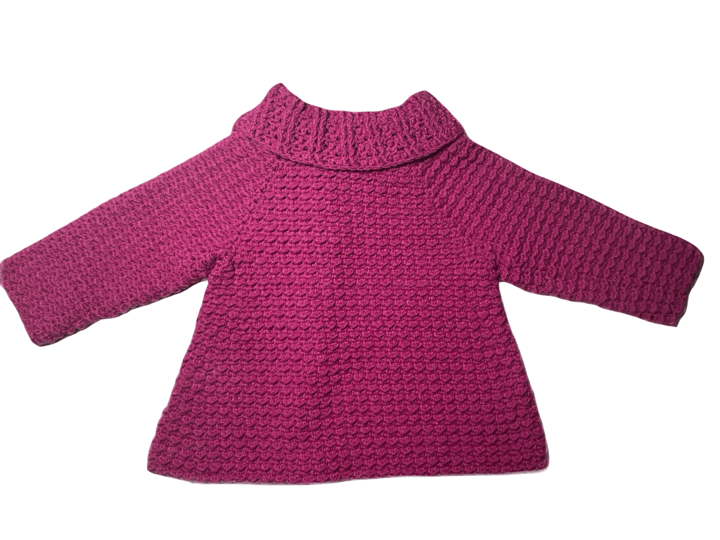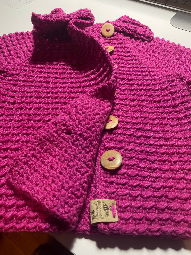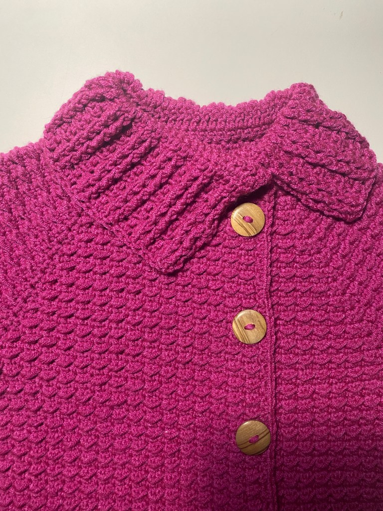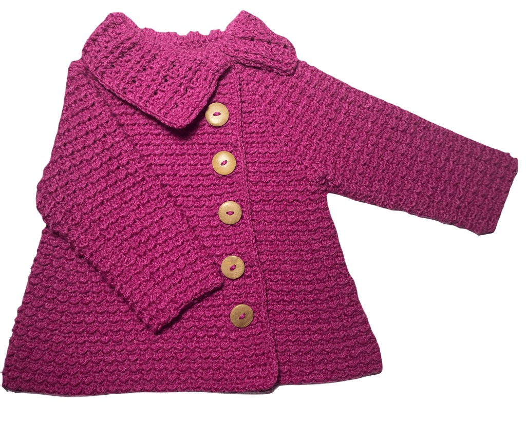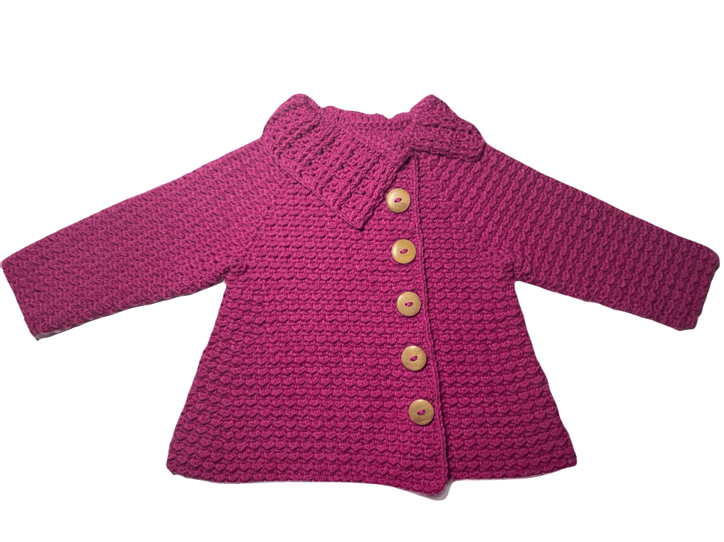 This is a warm, thick coat, ideal for the colder days of autumn and spring. It is made with acrylic-bamboo mix yarn, very soft and cozy to the touch, and natural wood side-buttons.