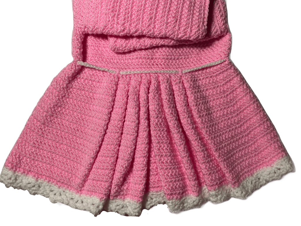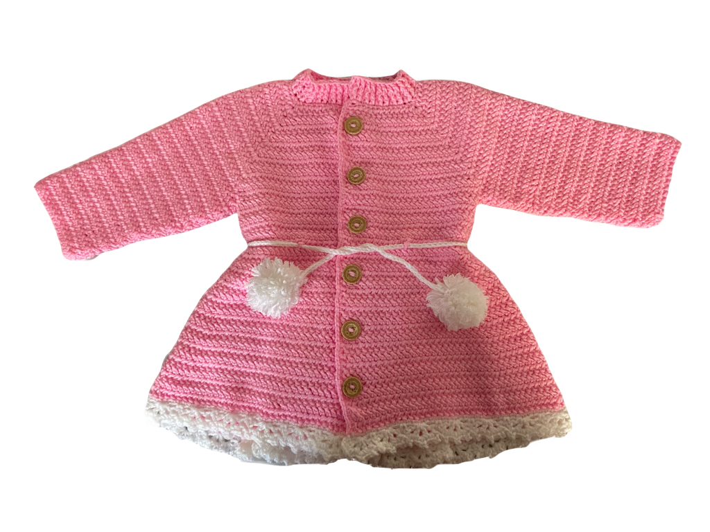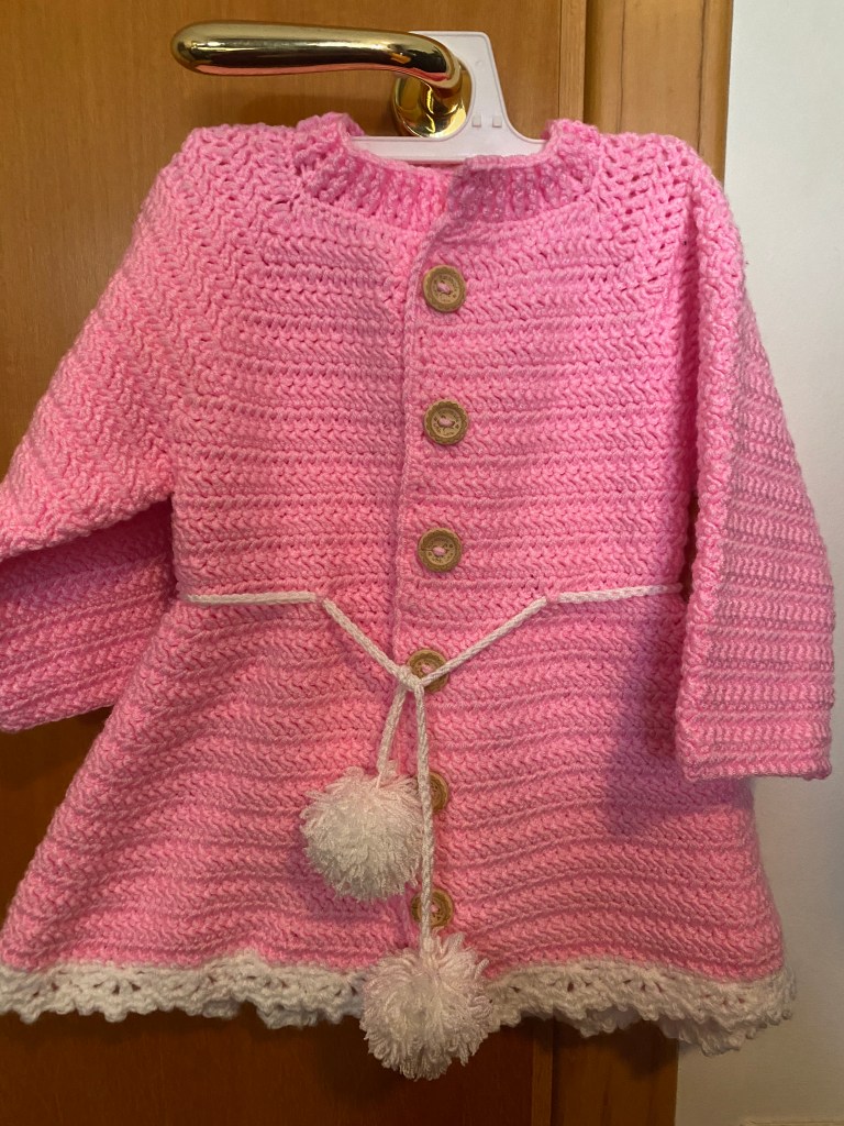 This is a long, soft coat, pretty and cozy. It is made with acrylic-bamboo mix yarn, very soft to the touch, and natural wood side-buttons.